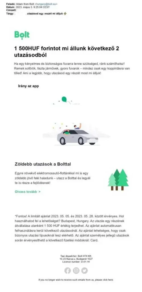 E-mailben küldött tájékoztatás Bolt-kedvezményről (Képernyőmentés forrása: Yellow Cab)