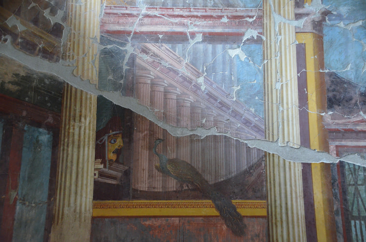 Különösen figyelemre méltó az a falrészlet, ahol egy teljes pávatojás-motívum jelenik meg, szimmetrikusan elhelyezve egy már korábban ismert hím pávával. A pávák a római ikonográfiában a gazdagság, a halhatatlanság és az isteni kegy jelképei voltak, így jelenlétük jól illeszkedik a villa reprezentatív funkciójához. Ugyanebben a teremben olyan töredékek is előkerültek, amelyek Pappust ábrázolják, az Atellana darabok állandó figuráját: a nevetséges öregembert, aki kétségbeesetten próbál fiatalosnak látszani. Ez a groteszk alak érdekes ellenpontja a pávák ünnepélyes szimbolikájának, és finom humorral árnyalja a tér üzenetét.
