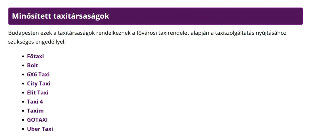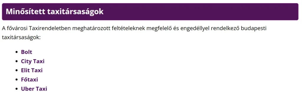 Minősített taxitársaságok listája, 2024. májusi állapot | Forrás: bkk.hu, web.archive.org