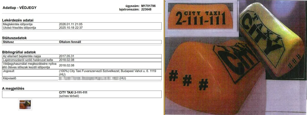 A taxiszolgáltatók többségénél az általuk használni kívánt szabadjelzőt a BKK Zrt. csak akkor fogadta el a minősítéshez, ha a taxijelzőt színes ábrás (színes térbeli) védjegyoltalomként jegyeztették be. Könnyen ellenőrizhető az SZTNH keresőjében is, hogy ilyen formában szerepelnek a fővárosi taxicégek szabadjelzői a hivatali adatbázisban. Néhány budapesti taxicég példáján keresztül megmutatjuk, hogy hogyan is kell kinéznie a tetőjelző védjegyoltalmi adatlapjának.