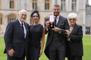 David Beckham pózol feleségével és szüleivel, miután lovagi címet kapott a Windsor-
