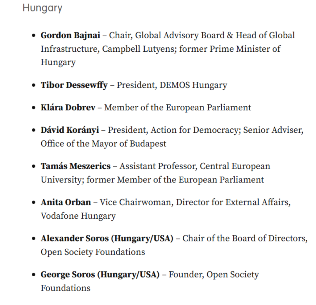 Az egyik ilyen a European Council on Foreign Relations (ECFR). A szervezet taglistája magáért beszélt: megtalálható rajta Soros György milliárdos és fia, Alexander, mellettük Dobrev Klára, a DK elnöke, Bajnai Gordon volt baloldali miniszterelnök és az a Korányi Dávid, aki az Action for Democracy vezetőjeként a 2022-es magyarországi választás idején milliárdos összegben irányított pénzt Amerikából Magyarországra a baloldal győzelmét elősegítendő.