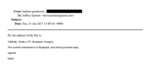 A magyar sajtóban most keringő képernyőfotók és cikkek szerint egy 2017. január 31-i emailben egy norvég filmes üzletember, Haakon Gundersen elküldte egy budapesti lakás címét Jeffrey Epstein-nek. A levél tárgyszerű: „a lakás címe… 1068 Budapest, Király utca 70”, majd egy félmondat arról, hogy a szerződés Budapesten van, és hamarosan továbbítják. Az aláírás nem a teljes név, csak egy becenév: „Hawk”.