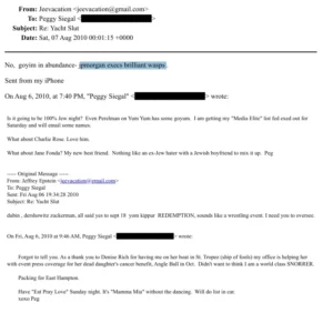 Azt például egyetlen „függetlenokbjektív” médium sem akarja megírni, vajon miért fontos a zsidó származású Peggy Siegalnak, hogy a megrendezésre kerülő Epstein-parti az „100 százalék zsidó este lesz-e”, vagy jelen lesznek „gójok is”? (Aki ismeri a Talmudot az tudja, hogy a „gój” a nem zsidót jelenti, kinek élete annyit ér, mint egy birkáé.)