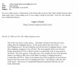 Egy másik levelezésében Epstein Roger Schanknak dicsekszik azzal, hogyan keresnek vagyonokat a zsidók. Erről ennyit mond: