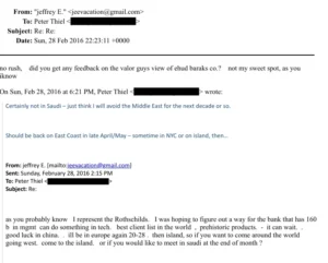 Egy másik levelezésnek a címzettje Peter Thiel, aki a PayPalban érdekelt, a Palantir vezetője, társa pedig a zsidó származású Alex Karp. Ebből a levelezésből kiderül, Epstein hazája a nagyvilág, folyamatosan utazik, s olyan, hogy „haza”, nem is létezik számára. Így gyakorlatilag bárhol lehet vele találkozni. Több helyszín után meg is hívta magához a hírhedté vált szigetére Thielt, hiszen oda tér majd vissza Európából bő egy hétre. És hogy miért járt Európában Epstein? Az is kiderült. A Rothschildokat képviselte, akiktől megkapta a „legjobb ügyféllistákat” is.