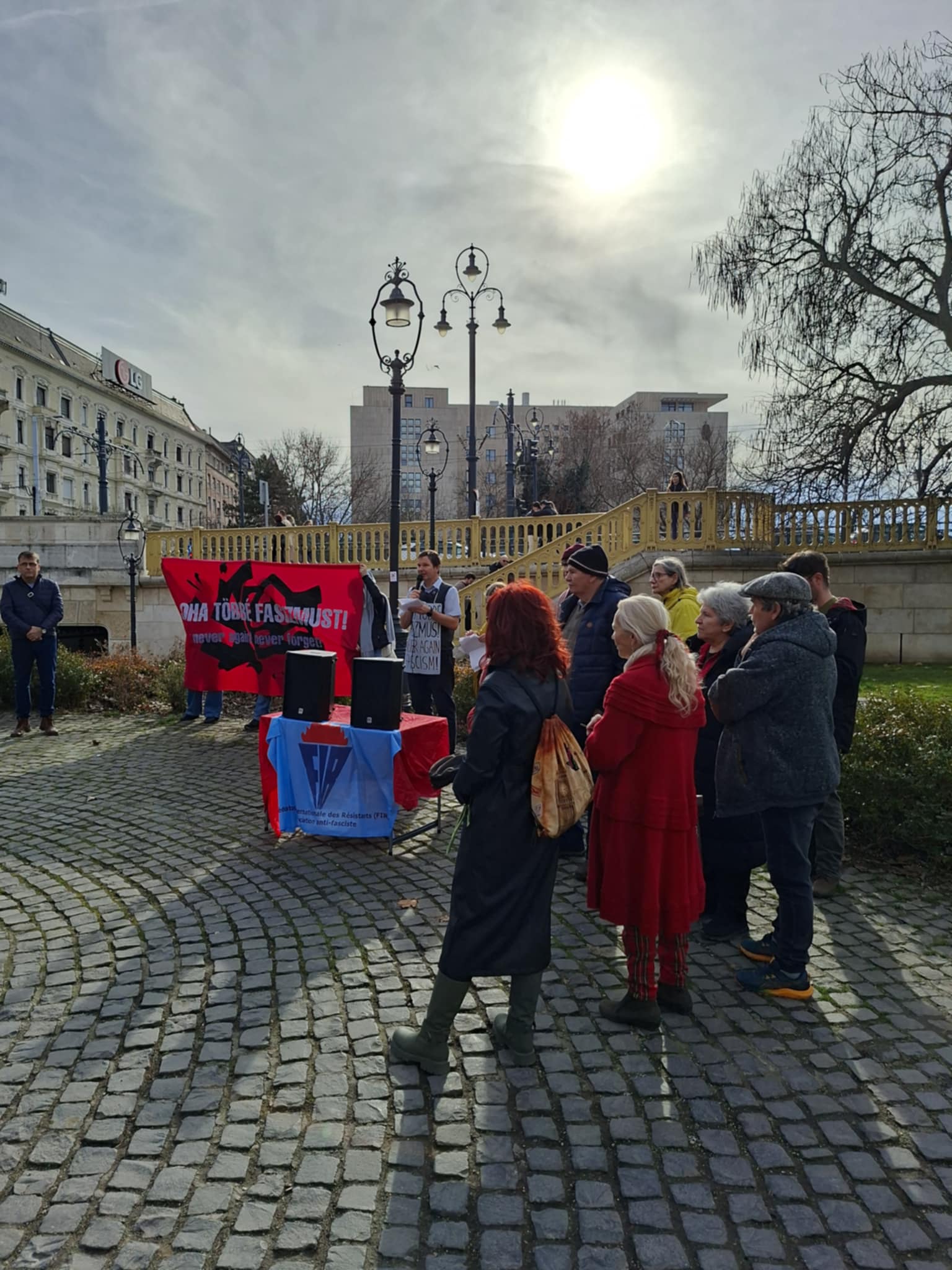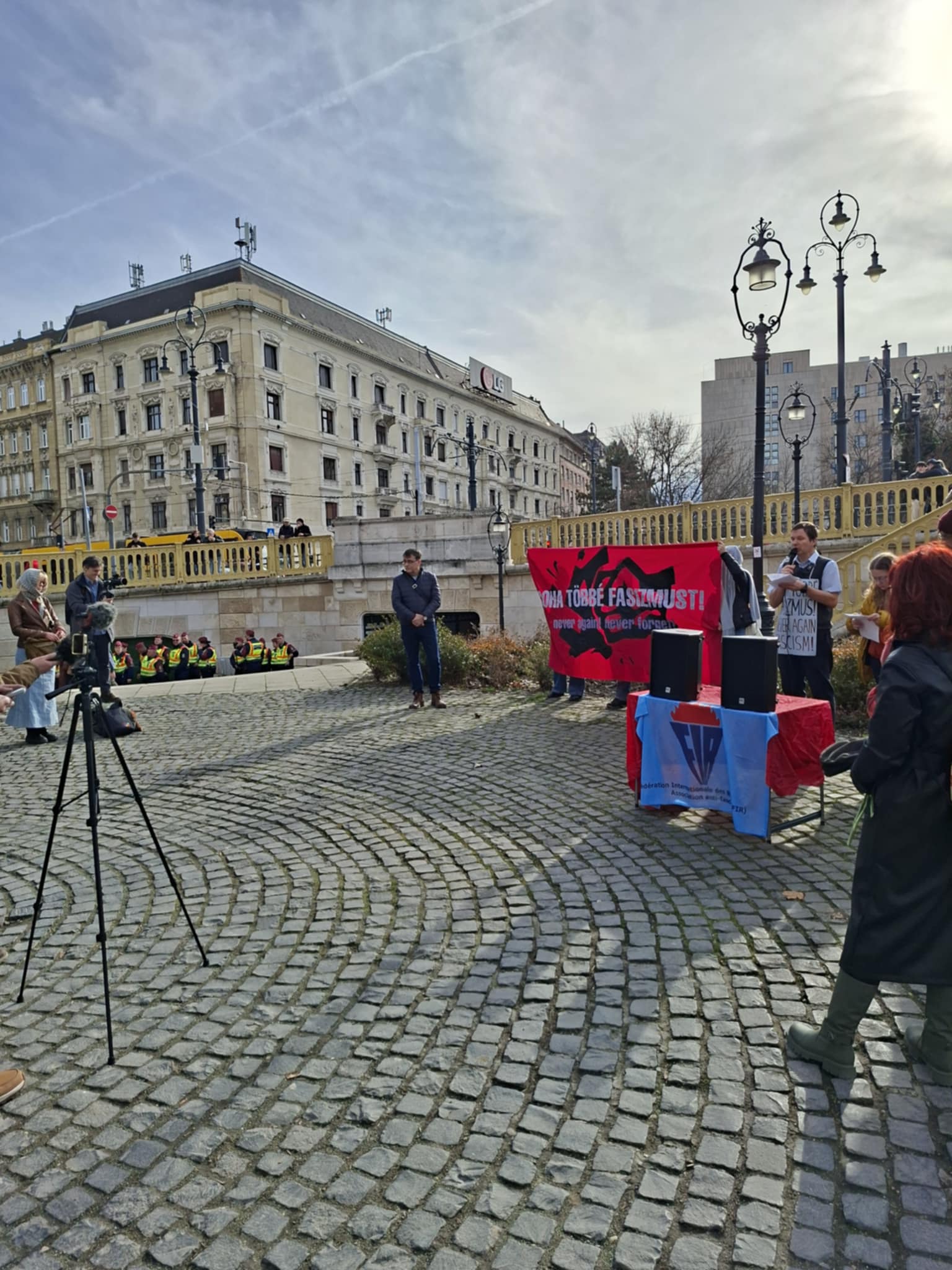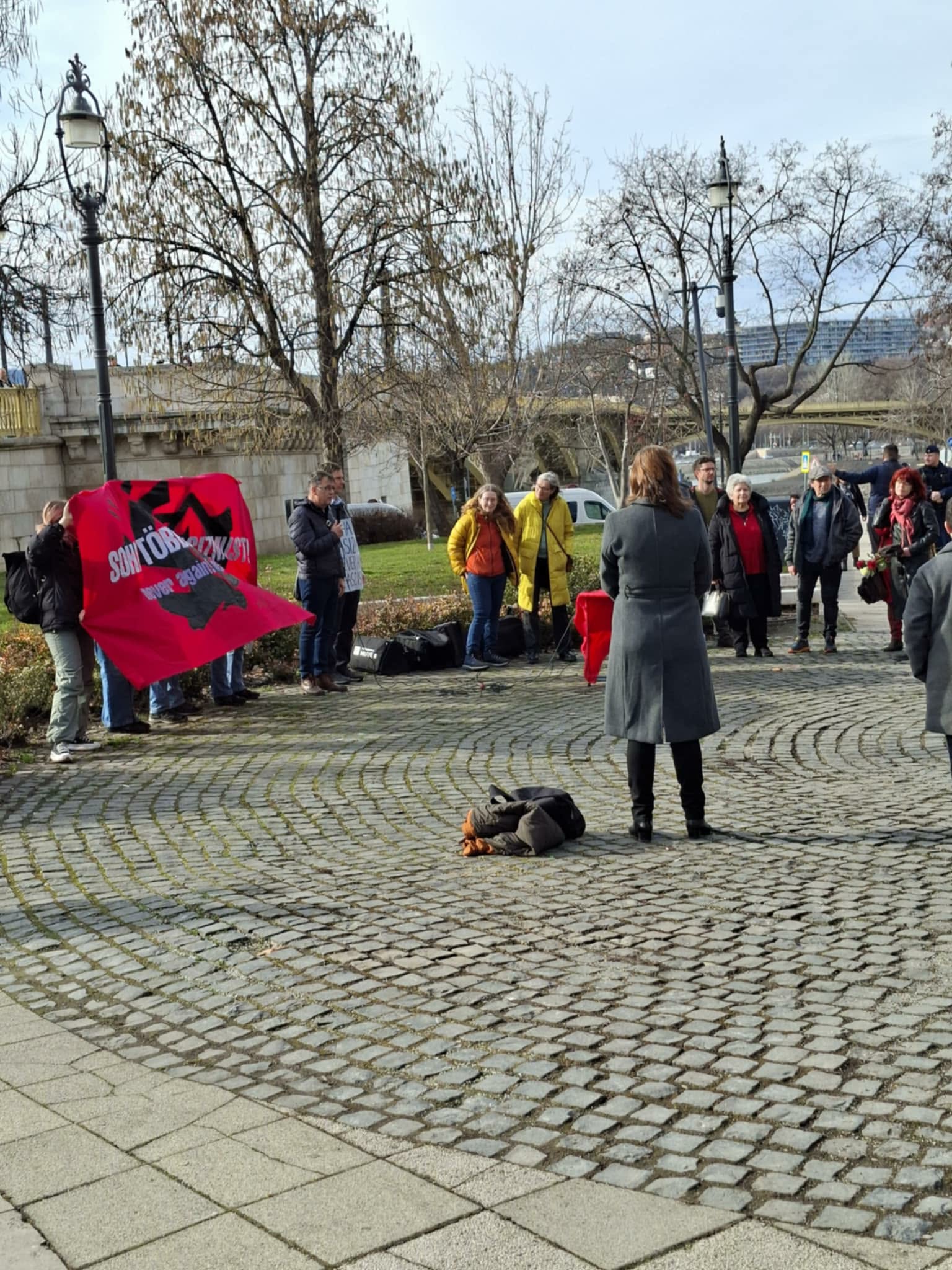Ennek ellenére a Margit híd pesti hídfőjénél, a Jászai Mari téren mégis összegyűltek jónéhányan. A szervezők a tiltás miatt az eseményt sajtótájékoztatónak nevezték át. A helyszínen beszédet mondott Vajnai Attila, valamint felszólalt a nemrégiben elítélt Simeon Ravi Trux édesapja is.