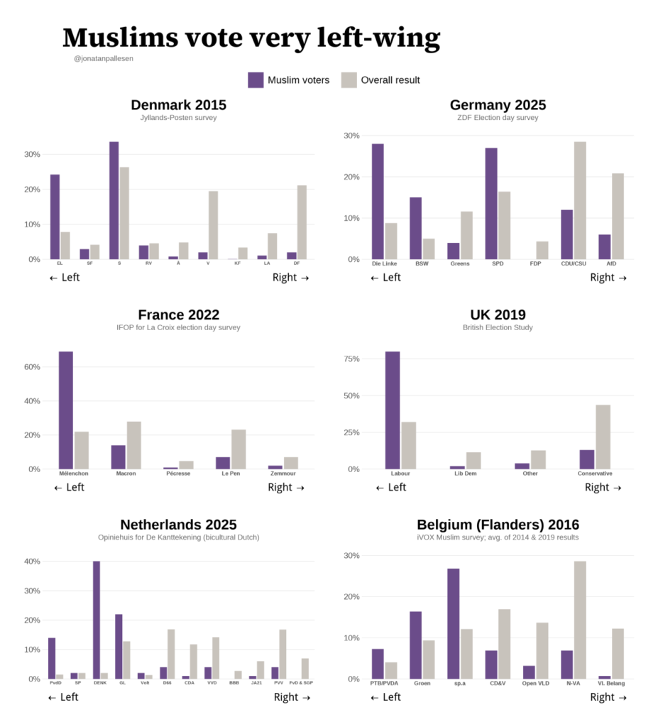 Több választási és közvélemény-kutatási elemzés különböző európai országokból egy feltűnő, országokon átívelő mintát mutat: a muszlim szavazók átlag feletti gyakorisággal szavaznak baloldali vagy balközép pártokat