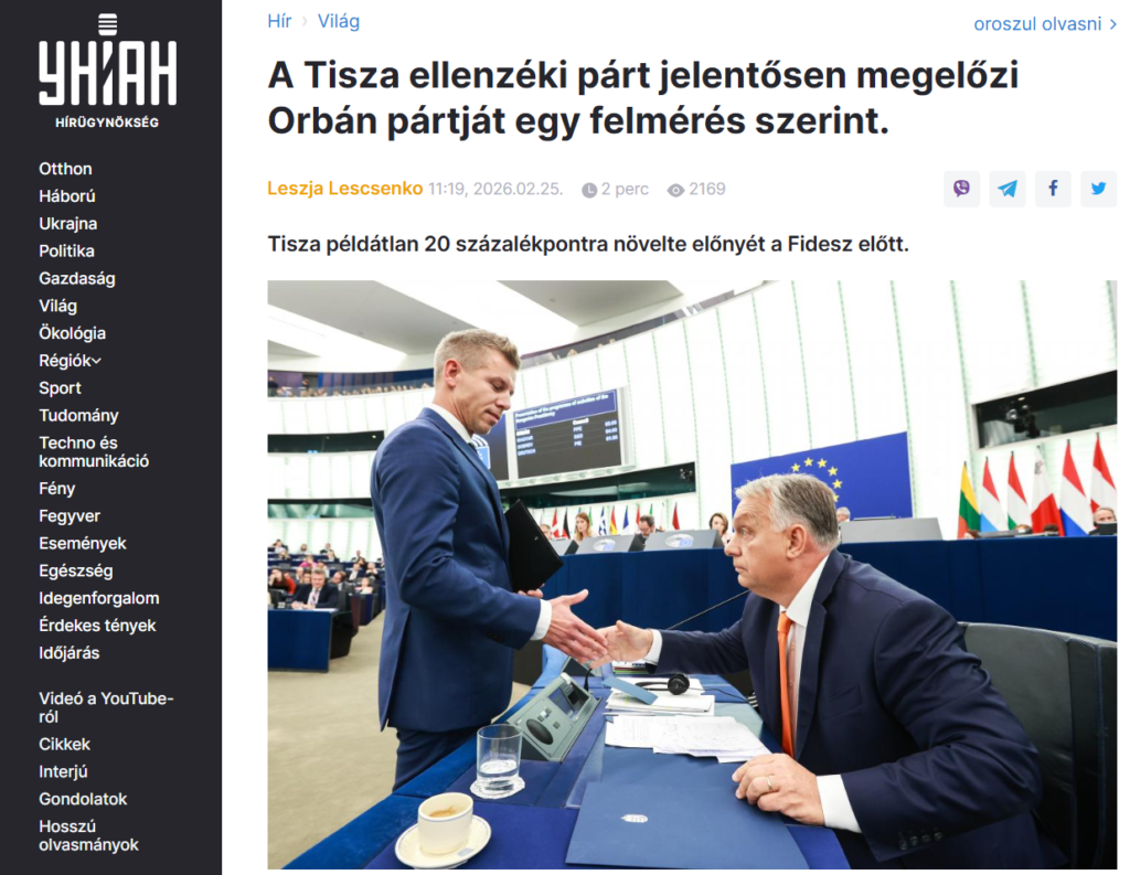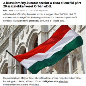 Az UNIAN már a címében azt zengte, hogy „a Tisza jelentősen megelőzi Orbán Viktor pártját egy felmérés szerint,” – „példátlannak” nevezve a két párt közötti különbséget. Írásuk első felében kivonatolták a hvg-n megjelent kutatást, külön kiemelve, hogy „január közepe óta folyamatosan erősödik” az ellenzéki párt. Ezzel értelemszerűen azt sugalmazták, hogy a Fidesznek nincs sok esélye, hiszen Magyar Péterék nagyon jönnek fel a kampányban.