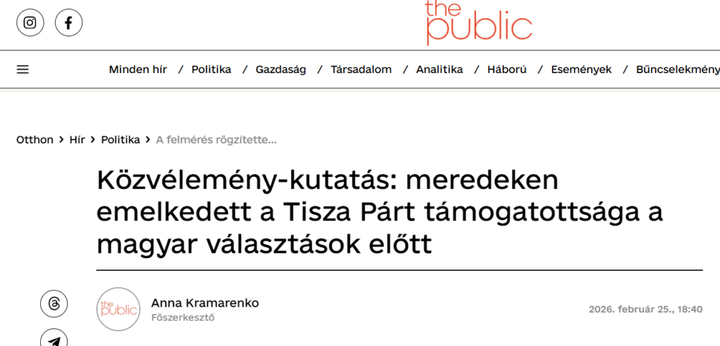 A folytatás ugyanebben a stílusban következett: a többi laphoz hasonlóan a The Public szerzője is azt állította, hogy „ez az eddigi legnagyobb különbség, amit független közvélemény-kutatók mértek.” Majd előkerült Magyar Péter nyilatkozata, miszerint a Medián által kikutatott eredmény elegendő lehet a Tisza kétharmados választási győzelméhez. Azt, persze, nem írták meg, hogy a kutatás eredményei hamisak.