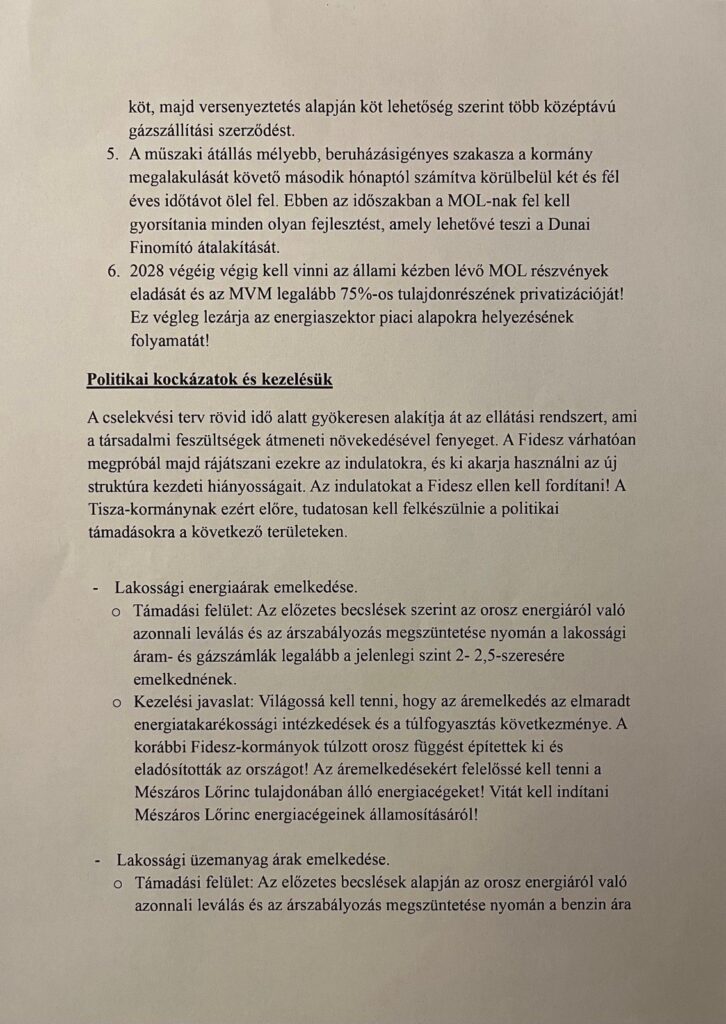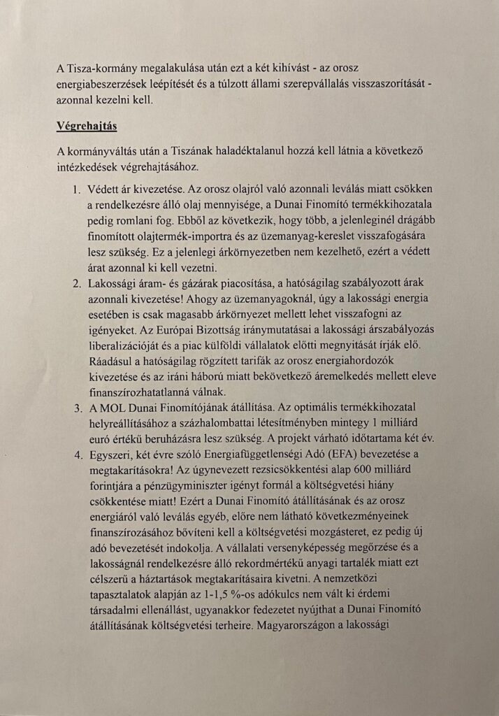 „Ezzel egyidejűleg törvényt kell benyújtani a közérdekű alapítványokban elhelyezett MOL részvények feletti állami kontroll visszaszerzéséről. Az új kormány hivatalba lépésének napján – várhatóan T+14 nap – energia veszélyhelyzetet kell hirdetni és az első kormányülésen haladéktalanul ki kell mondani, hogy Magyarország beszünteti az orosz energiahordozók vásárlását” – részletezték, hozzátéve, felállítanak majd egy energiaátállási cselekvési terv végrehajtásáért felelős stábot, amely napi operatív koordinációval irányítja az átmenetet, majd azonnali MOL közgyűlést kell összehívni, új igazgatósági tagokat kell delegálni és a MOL élére új vezetést kell állítani.