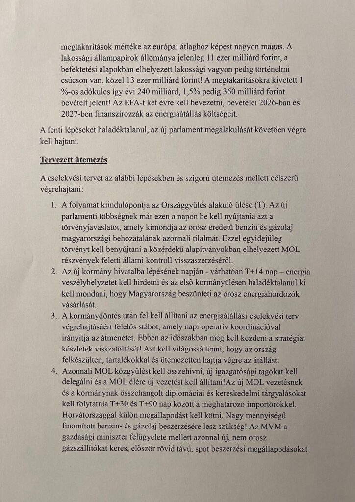 „Az új MOL vezetésnek és a kormánynak összehangolt diplomáciai és kereskedelmi tárgyalásokat kell folytatnia T+30 és T+90 nap között a meghatározó importőrökkel. Horvátországgal külön megállapodást kell kötni. Nagy mennyiségű finomított benzin- és gázolaj beszerzésére lesz szükség! Az MVM a gazdasági miniszter felügyelete mellett azonnal új, nem orosz gázszállítókat keres, először rövid távú, spot beszerzési megállapodásokat köt” – olvasható a Csercsa Balázs által közzétett dokumentumban.