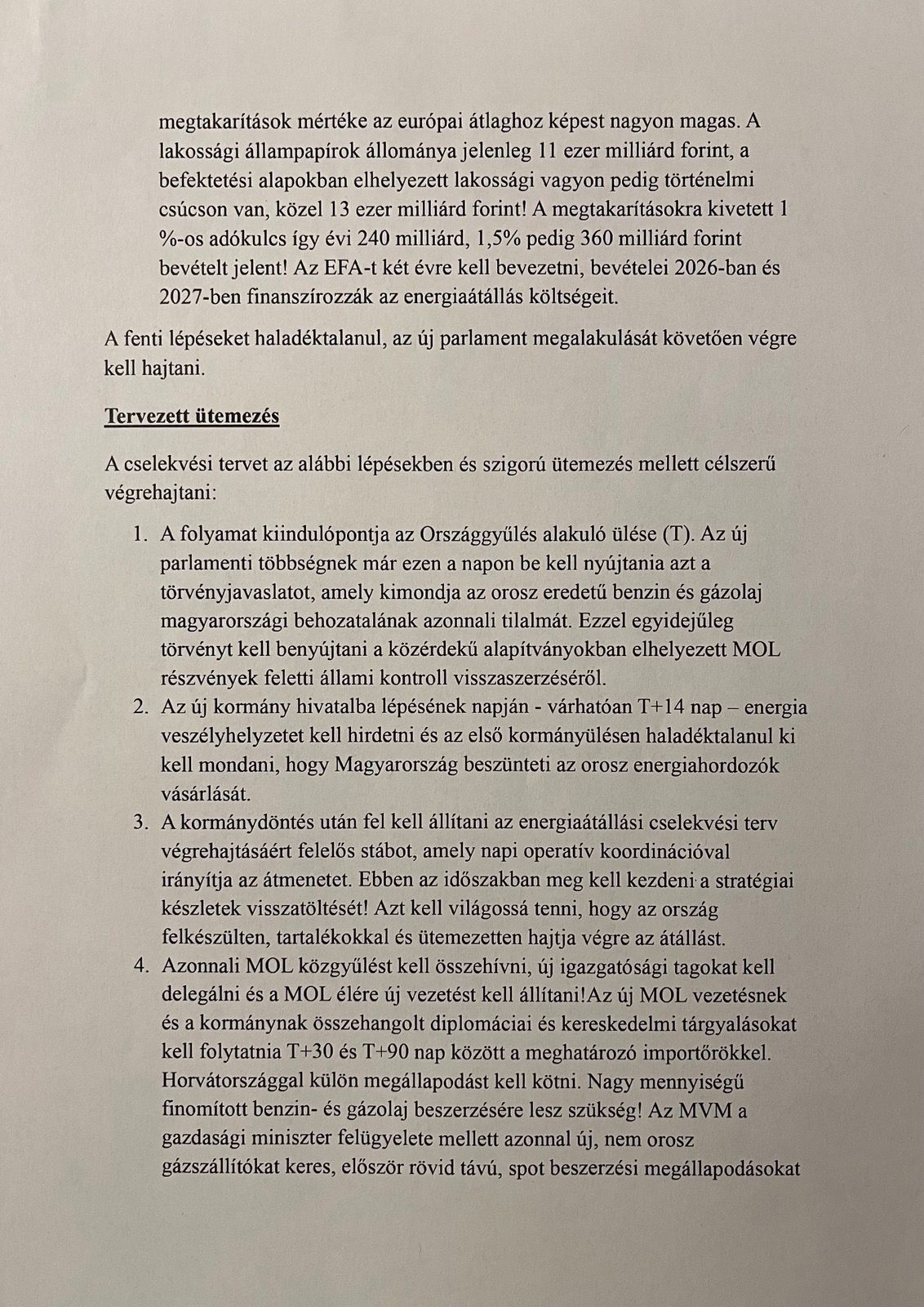 „Ezzel egyidejűleg törvényt kell benyújtani a közérdekű alapítványokban elhelyezett MOL részvények feletti állami kontroll visszaszerzéséről. Az új kormány hivatalba lépésének napján – várhatóan T+14 nap – energia veszélyhelyzetet kell hirdetni és az első kormányülésen haladéktalanul ki kell mondani, hogy Magyarország beszünteti az orosz energiahordozók vásárlását” – részletezték, hozzátéve, felállítanak majd egy energiaátállási cselekvési terv végrehajtásáért felelős stábot, amely napi operatív koordinációval irányítja az átmenetet, majd azonnali MOL közgyűlést kell összehívni, új igazgatósági tagokat kell delegálni és a MOL élére új vezetést kell állítani.