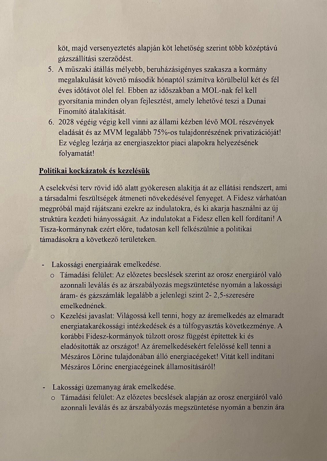 „Az új MOL vezetésnek és a kormánynak összehangolt diplomáciai és kereskedelmi tárgyalásokat kell folytatnia T+30 és T+90 nap között a meghatározó importőrökkel. Horvátországgal külön megállapodást kell kötni. Nagy mennyiségű finomított benzin- és gázolaj beszerzésére lesz szükség! Az MVM a gazdasági miniszter felügyelete mellett azonnal új, nem orosz gázszállítókat keres, először rövid távú, spot beszerzési megállapodásokat köt” – olvasható a Csercsa Balázs által közzétett dokumentumban.