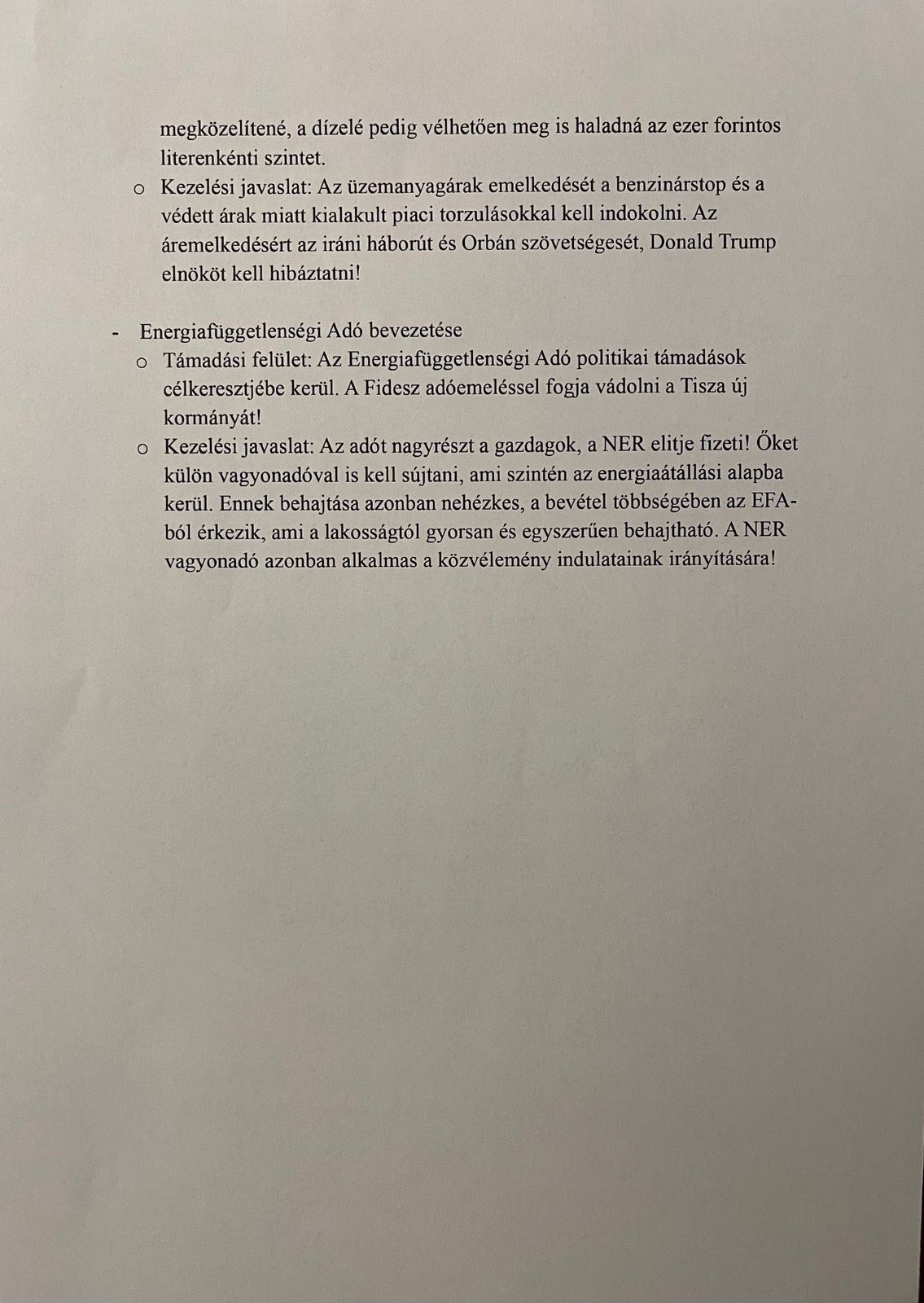 - Energiafüggetlenségi Adó bevezetése miatti támadási felület: Az Energiafüggetlenségi Adó politikai támadások célkeresztjébe kerül, a Fidesz adóemeléssel fogja vádolni a Tisza új kormányát! Kezelési javaslat: Az adót nagyrészt a gazdagok, a NER elitje fizeti, őket külön vagyonadóval is kell sújtani, ami szintén az energiaátállási alapba kerül. Ennek behajtása azonban nehézkes, a bevétel többségében az EFA-ból érkezik, ami a lakosságtól gyorsan és egyszerűen behajtható. A NER vagyonadó azonban alkalmas a közvélemény indulatainak irányítására!