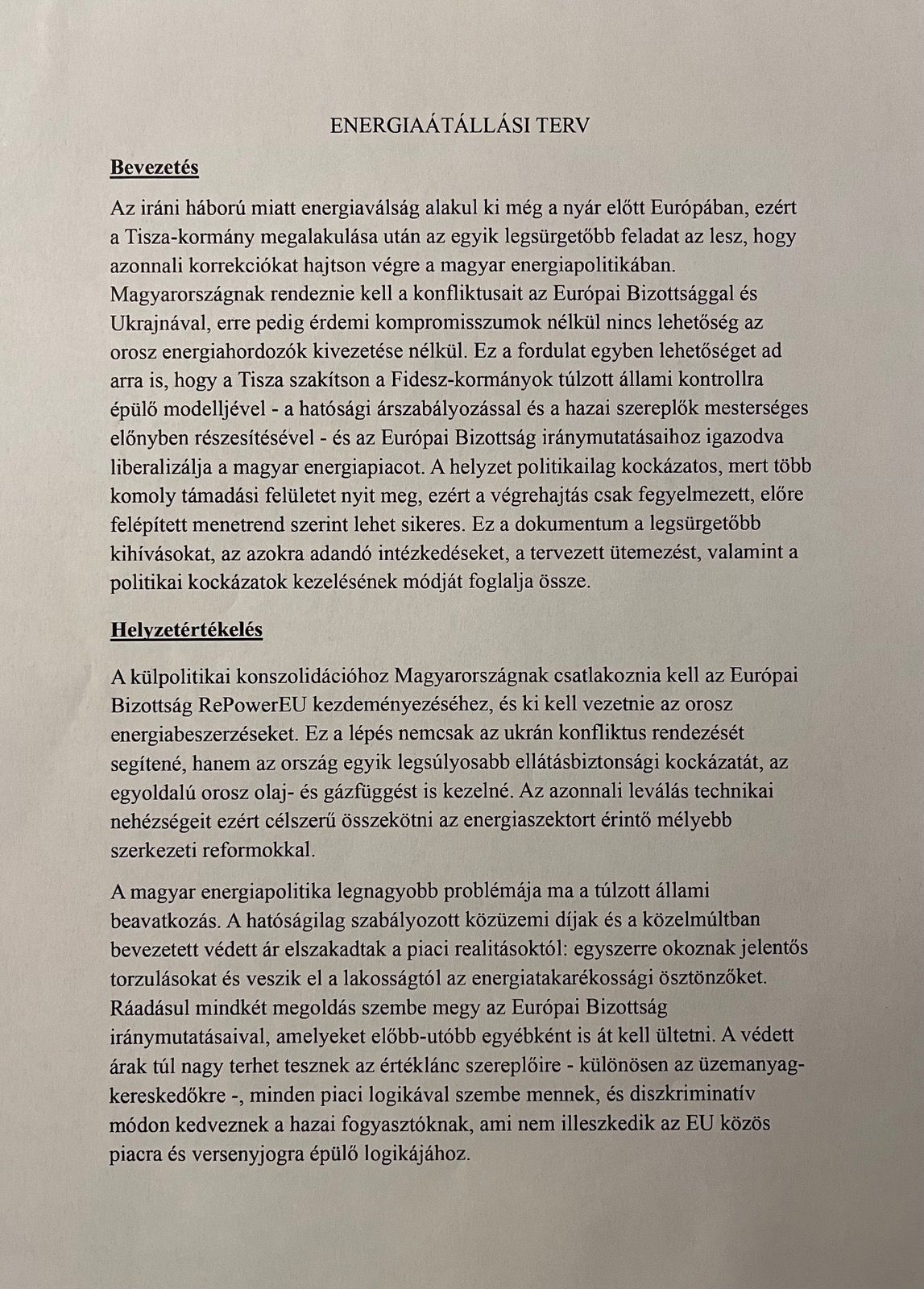 „Magyarországnak rendeznie kell a konfliktusait az Európai Bizottsággal és Ukrajnával, erre pedig érdemi kompromisszumok nélkül nincs lehetőség az orosz energiahordozók kivezetése nélkül. Ez a fordulat egyben lehetőséget ad arra is, hogy a Tisza szakítson a Fidesz-kormányok túlzott állami kontrollra épülő modelljével – a hatósági árszabályozással és a hazai szereplők mesterséges előnyben részesítésével – és az Európai Bizottság iránymutatásaihoz igazodva liberalizálja a magyar energiapiacot” – olvasható a közzétett dokumentumban, amely szerint ennek érdekében ki kell vezetni a benzin védett árát, a csökkentett rezsiár helyett piaci árat kell bevezeti, a MOL finomító átállítását el kell végezni, és az ennek költségeire fedezetet biztosító új energiafüggetlenségi adót kell bevezetni.