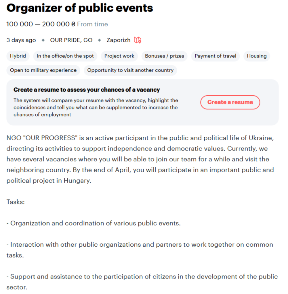 🇺🇦🇭🇺 “Our Pride,” a Ukrainian NGO with links to Zelensky’s former Chief of Staff Andriy Yermak, is hiring people to “participate in an important public and political project in Hungary.”