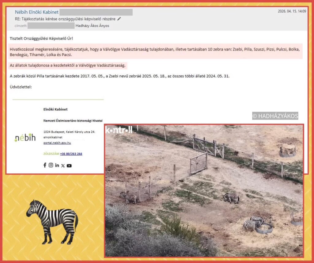 A NÉBIH válasza végül a választások után érkezett meg, amelyben hivatalos jegyzéket közöltek a Válvölgye Vadásztársaság tulajdonában álló zebrákról. A név szerint felsorolt állatok: Zsebi, Pilla, Szuszi, Pizsi, Pulcsi, Bolka, Bendegúz, Tihamér, Lolka és Pacsi. A hatóság adatai szerint az állatok tartása különböző időpontokban kezdődött, Pilla például már 2017 óta a birtokon él. A hivatalos válasz azonban éles ellentétben áll a Kontroll legfrissebb, drónnal készült felvételeivel. Az újság szerkesztősége szerint a terület alapos átvizsgálása után is csupán négy egyedet sikerült azonosítaniuk a szafari parkon belül épített, elszeparált karámban, ami újra felerősítette a gyanút a hiányzó állatok sorsa körül.