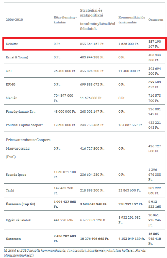 Mint írják, nemzetközi tanácsadócég 2006 és 2010 között összesen 857 millió forintnyi állami megbízást kapott, ezzel az egyik legnagyobb kedvezményezettje lett az akkori kormányzati megrendeléseknek.