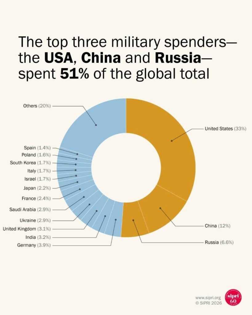 A legnagyobb katonai költségvetés továbbra is az Egyesült Államoké (954 milliárd dollár), Kínaé (336 milliárd dollár) és Oroszországé (190 milliárd dollár), amelyek a globális katonai kiadások 51%-át teszik ki.