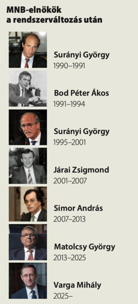 Az egyetlen kivétel Varga Mihály, aki 2025. március 4-én kezdte meg hatéves megbízatását a Magyar Nemzeti Bank (MNB) elnökeként, megbízatása a törvényi előírásoknak megfelelően 2031 márciusáig tart. A tisztséget Matolcsy Györgytől vette át.